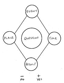 The blank sheet represents your subconscious mind, your template, a place of total awareness, the practical plastic mold on which you can consciously create. As soon as you give it a clear, precise plan it will immediately put that plan into action. Those instructions are your thoughts ; fix those thoughts, make them become visible and easily understandable for any observer by giving it a mental and emotional pattern, in the form of simple geometric shapes and key words. As soon as you place a vibration within your template, either physically or by mental projection the blank state is automatically ruptured, collapses and the vibration that you have introduced fills it and is put immediately into action. Your mind is a goal seeking organism, provide it with a focused target and it will automatically bring it into your reality. There are three key factors concerning questions about the future 1- What will happen at a certain place at a certain moment in time, you're searching for the « event ». 2- When will the event happen at a certain place, you're searching for the moment in « time » 3- Where will the event take place at a certain moment in time, you're searching for the geographic location, the « place » Each of these three factors can be represented graphically in the form of a disk, a fourth disk is necessary to represent the result or answer to the question. Combining all this into a single homogenous form by joining each disk with a tension line and including the interior canal structure, the graphic can now be traced