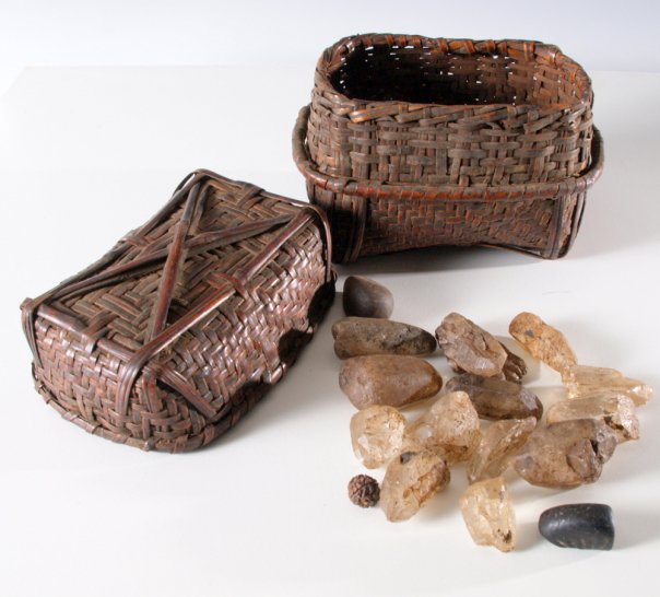 Among the Shamanic articles I have collected is a small basket of crystals about 6"x7"x5". These were used by a Shaman in Nepal. The large basket (kit) also contains a variety of other articles. If you will scroll down to a picture of a large basket with a smaller basket (in another image) you can see the crystals used by this Shaman. The pictures of articles in this kit continue until you see a beautiful old bell with an incredible use patina. All the articles fit into the large basket, except the drum. ANd here is the basket and crystals that came in he kit. It smells of smoke and incense.
